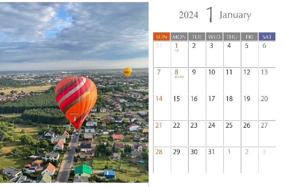 - ※6ジュニア熱気球世界選手権の大会期間中に撮影した写真を集めた卓上カレンダーです。大会中の写真をオリジナルカレンダー(A5サイズ)にしてお届けします。(送付は大会約1ヶ月後予定) 画像はあくまでイメージであり、左半分には今回大会の写真が入りますのでご注意ください。ポーランド・グルジョンツにて世界と戦うジュニアチームの様子をお楽しみください!